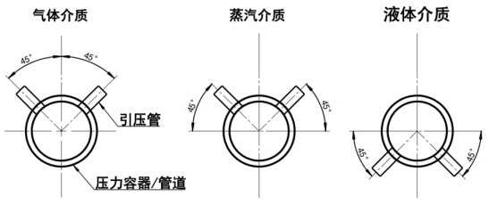 ▲当测量气体介质时,引压管应安装在垂直向上及两侧45°范围内,变送器应装在侧面取压口上方,以便液体排入过程管道。