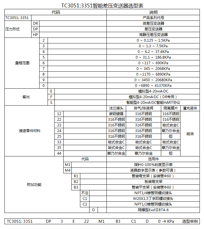 TC-3351/3051智能差压变送器主要用于测量气体、液体、蒸汽的差压、压力、液位和密度,然后将其转换成4-20mA·DC信号输出,差压变送器包括DP型(差压型)、HP型(高静压差压)和DR型(微差压)三种类型。它可通过HART协议的手操器相互通信,进行设定和监控。